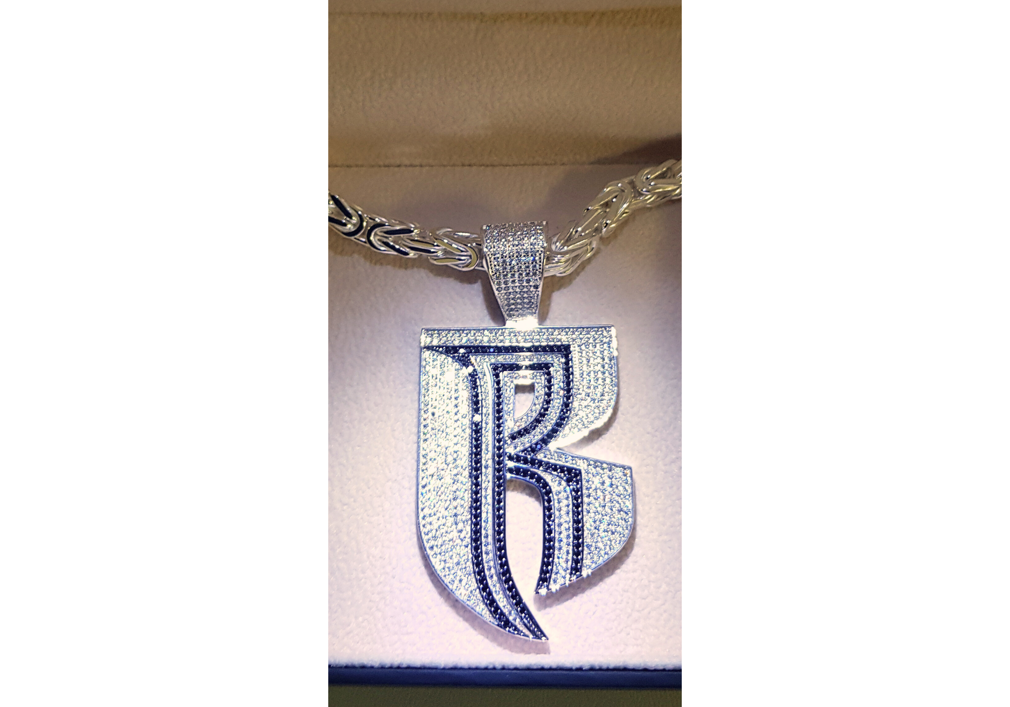 Er möchte gerne das "R" von DMX als 925er Sterling Silberanhänger, besetzt mit hochwertigen Zirkonia Steinen in 2 Farben.