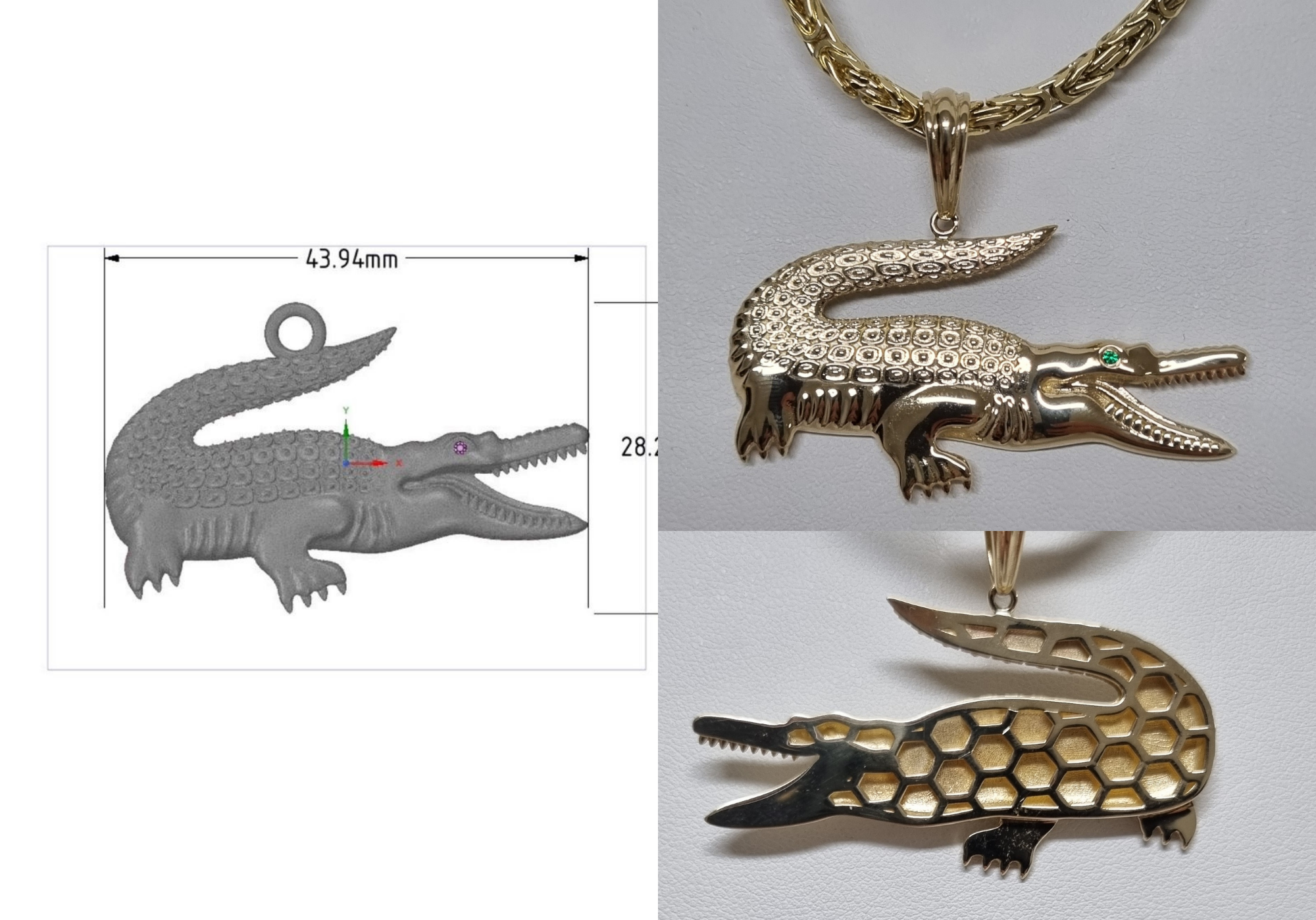 Vorlage mit Maße vom Kunden + Details besprochen wie "Rückseite soll offen sein mit vielen Hexagonen (6Eck) versehen und das Auge mit einem Smaragd ersetzen."