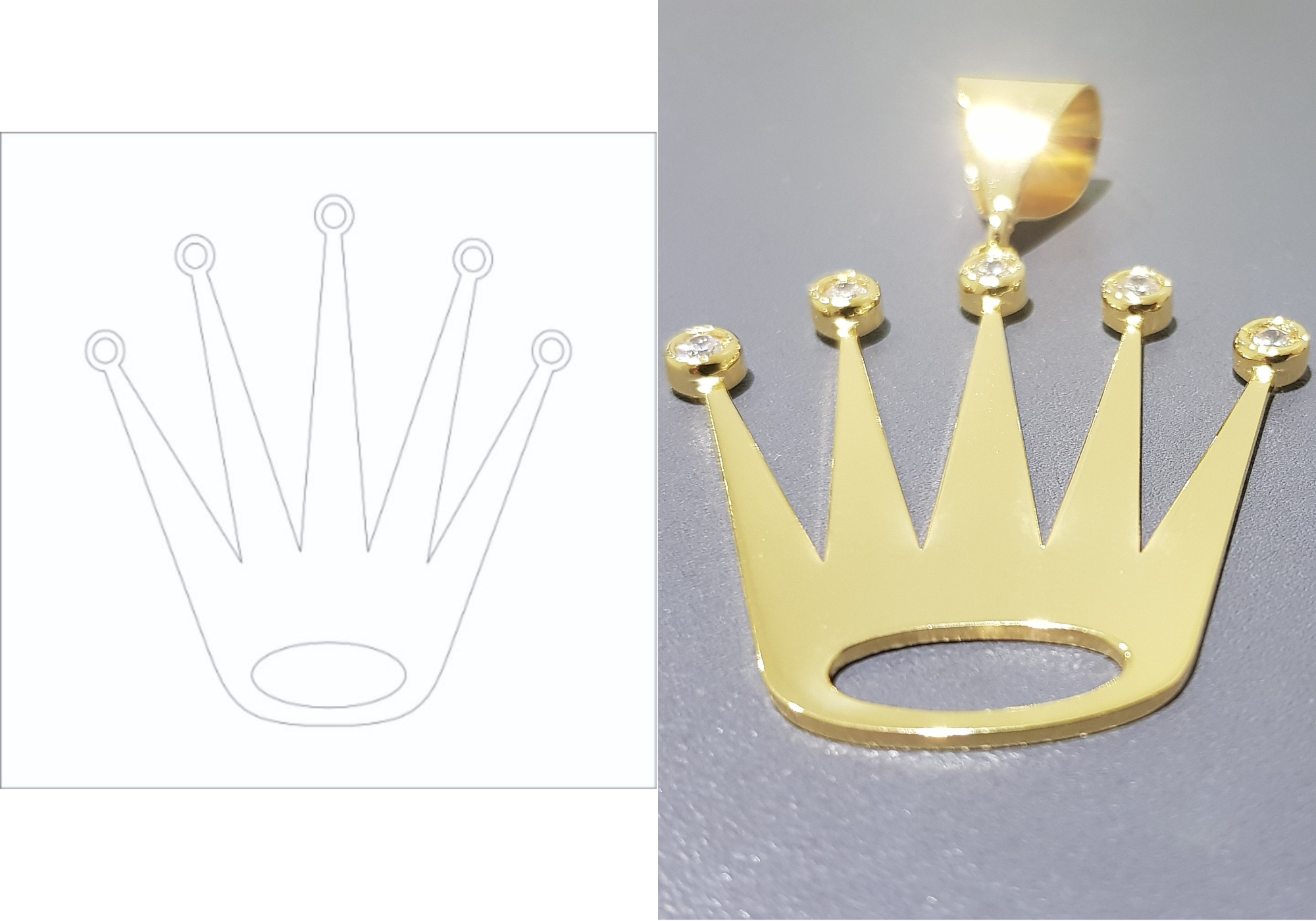 Die Vorlage vom Kunden (links) mit der Bitte um Einarbeitung von Zirkoniasteinen in den Kronenspitzen.